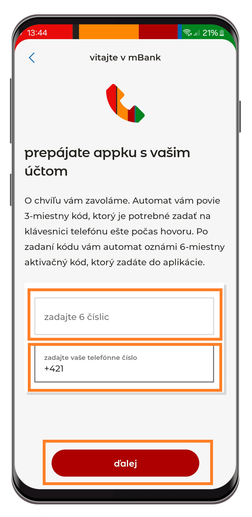 - Potom vám nadiktuje šesťmiestny číselný kód, ktorý zadáte do aplikácie mBank. Zadajte aj svoje telefónne číslo a kliknite na „Ďalej“.