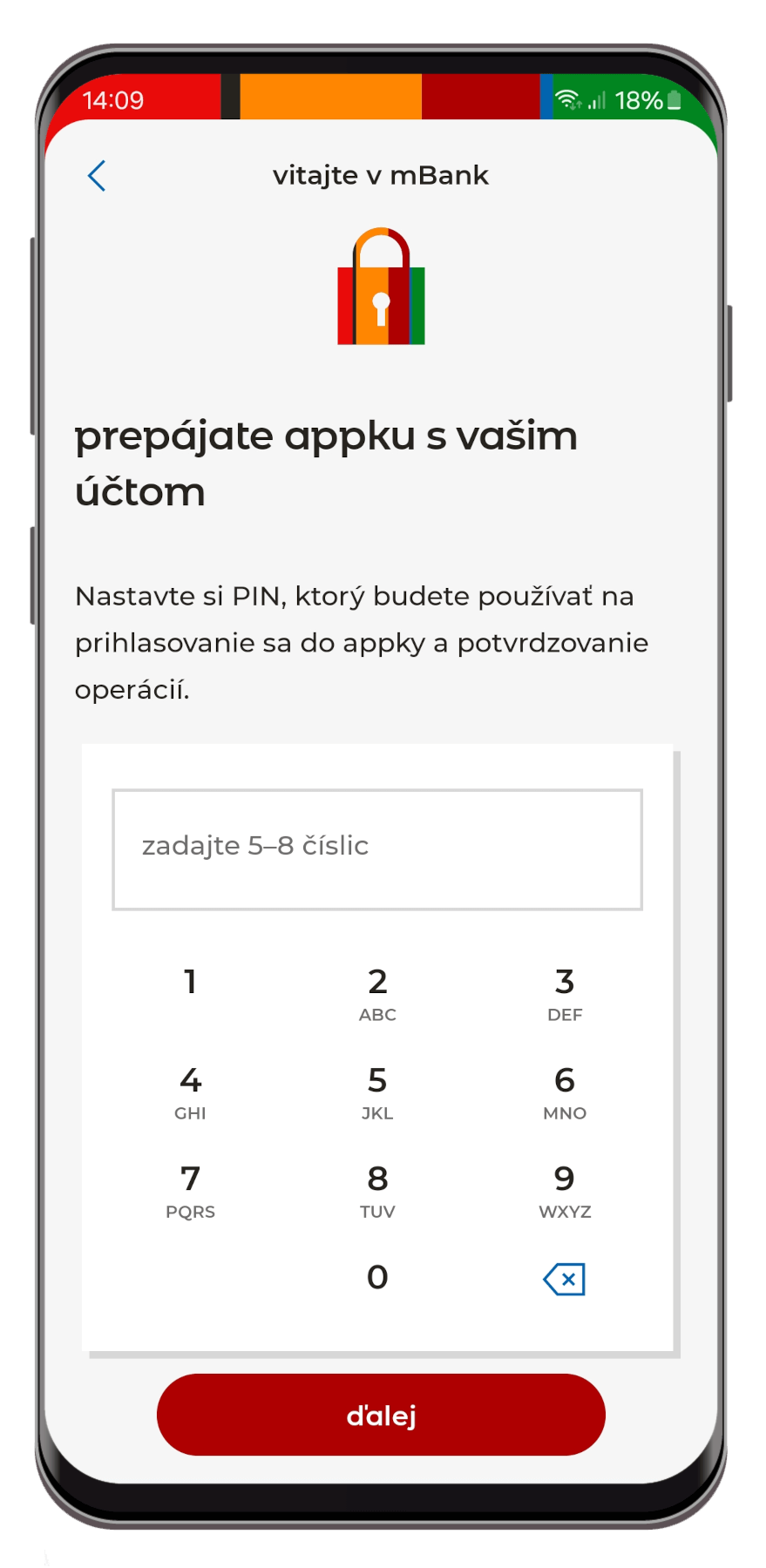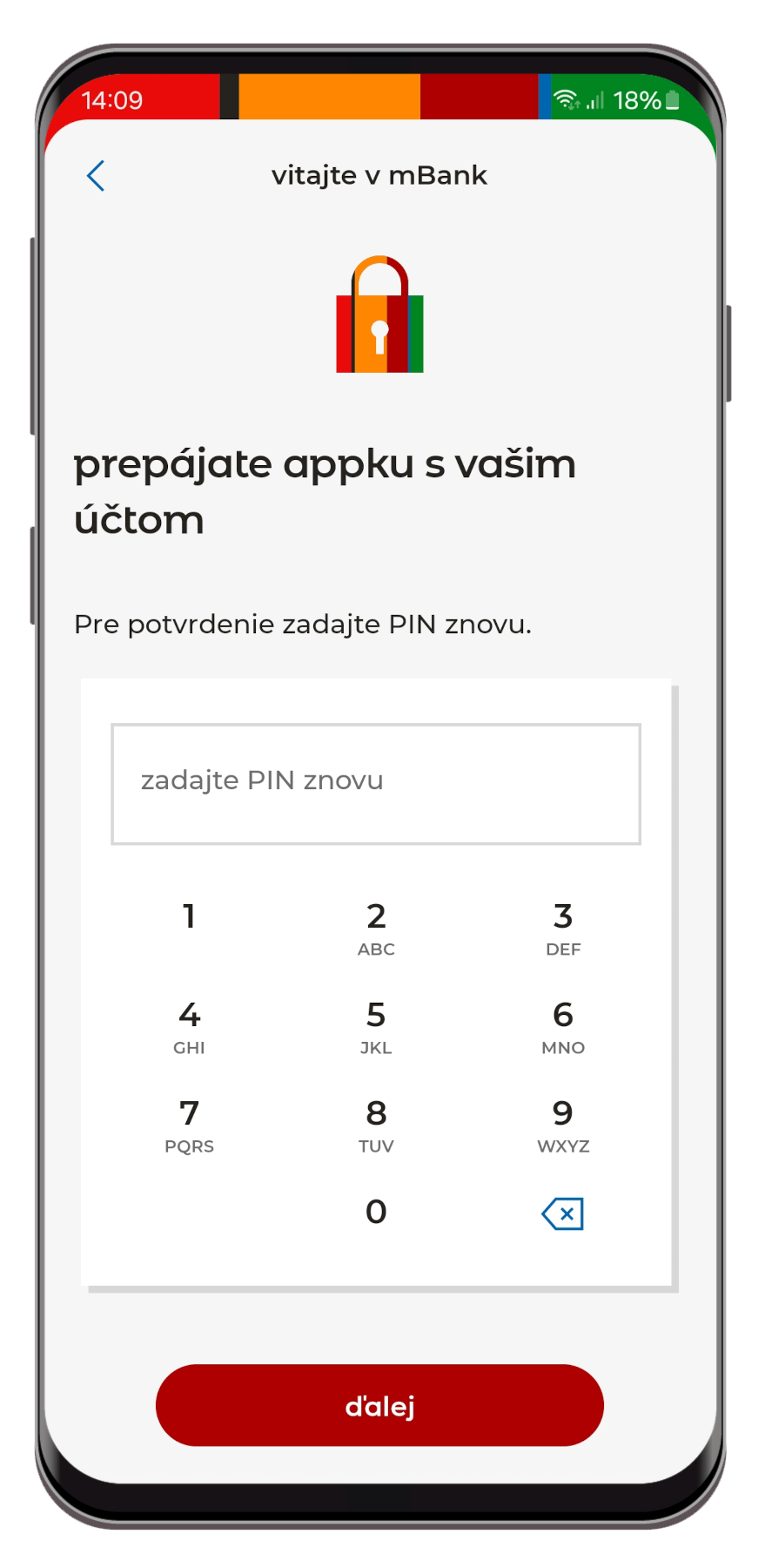 - Po overení vašej SMS vám zavolá automat, ktorý vám nadiktuje 4 číslice. Vy ich už len zadáte do aplikácie mBank a kliknete na „ďalej“. Pokračujte na krok 14.
