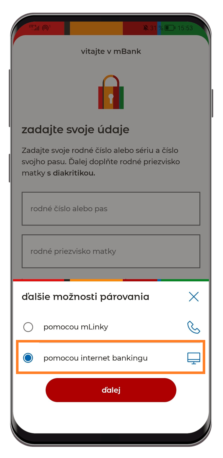 - Potom na ďalšej obrazovke zvoľte „pomocou internet bankingu“ a kliknite na „ďalej“.