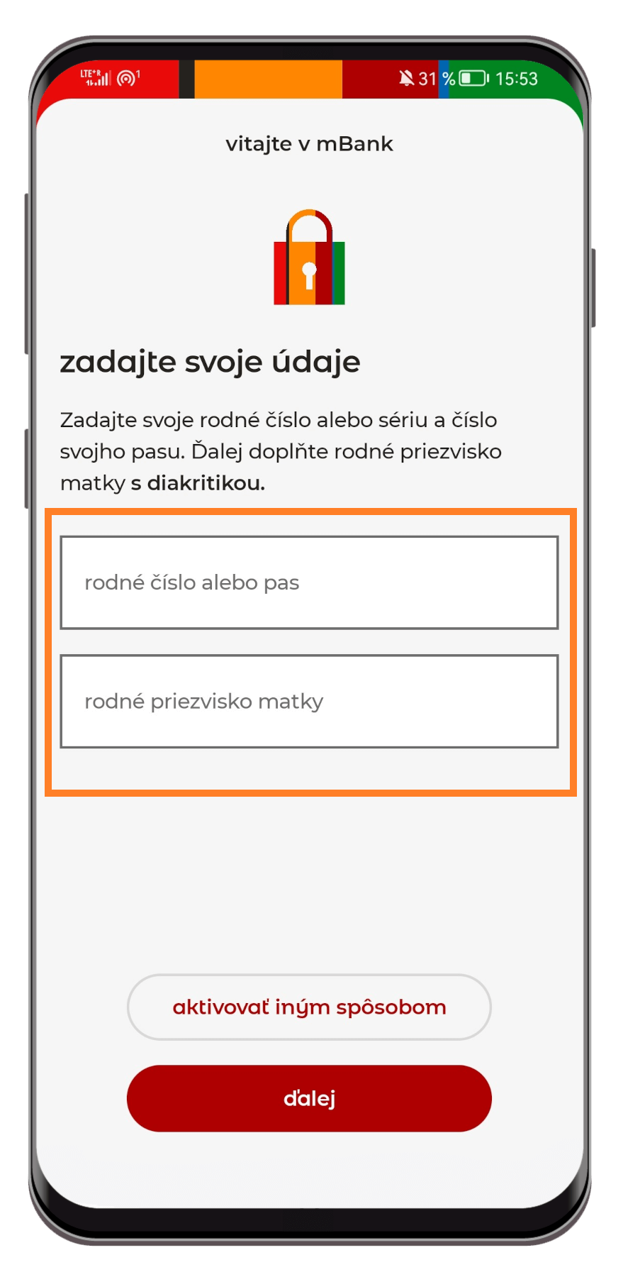 - Vyplňte svoje rodné číslo vrátane lomky (alebo číslo a sériu pasu) a rodné priezvisko matky vrátane diakritiky. Ak prepájate aplikáciu s mKontom pre deti, treba uviesť údaje dieťaťa. Kliknite na „ďalej“.