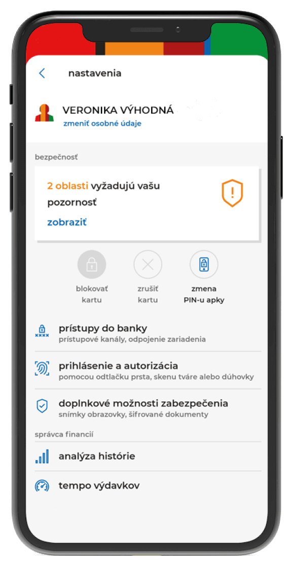 Spojenie mobilnej aplikácie s bankou sa riadi najprísnejšími bezpečnostnými štandardmi, ktoré sú aktuálne platné. Používajte vždy len aktuálnu verziu našej aplikácie a pravidelne aktualizujte operačný systém svojho telefónu