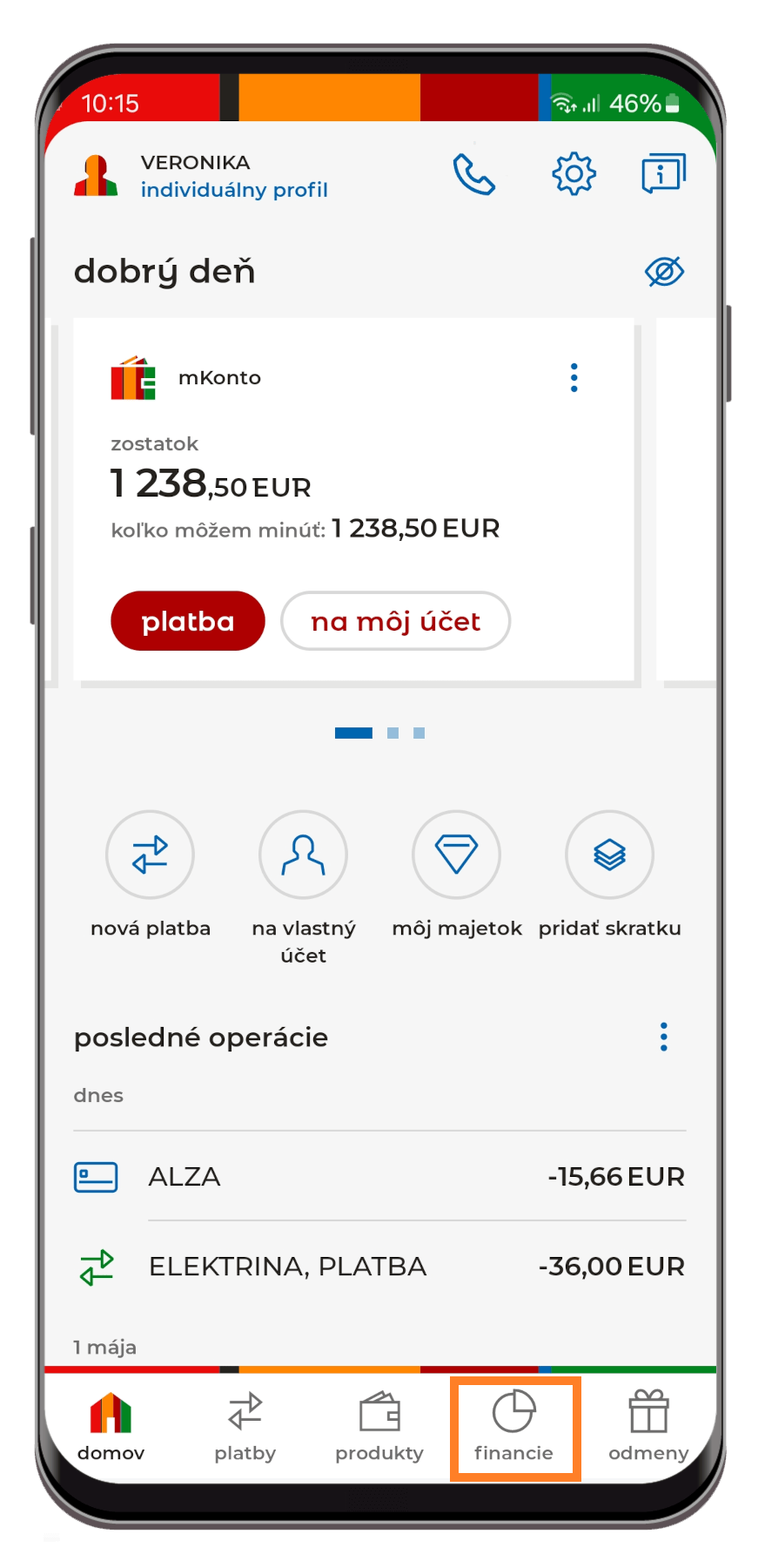 1. Po prihlásení sa do apky kliknite na položku Financie v dolnej časti obrazovky.