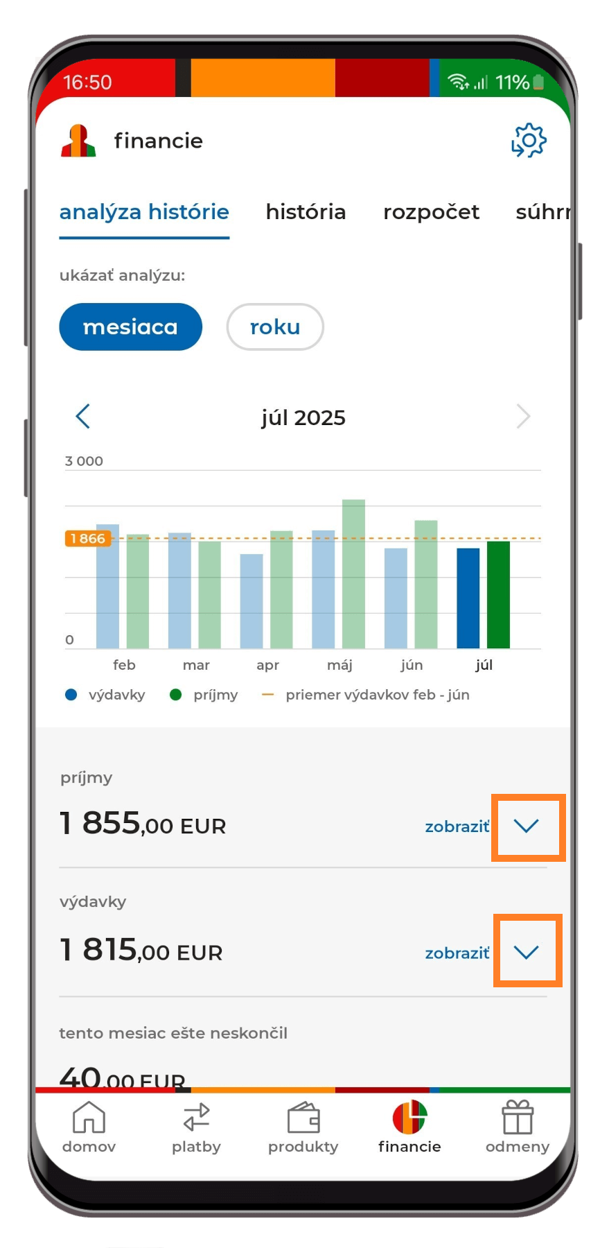2. Zobrazí sa vám prehľad príjmov a výdavkov v danom mesiaci. Pre podrobnosti stačí rozkliknúť príslušnú kategóriu.