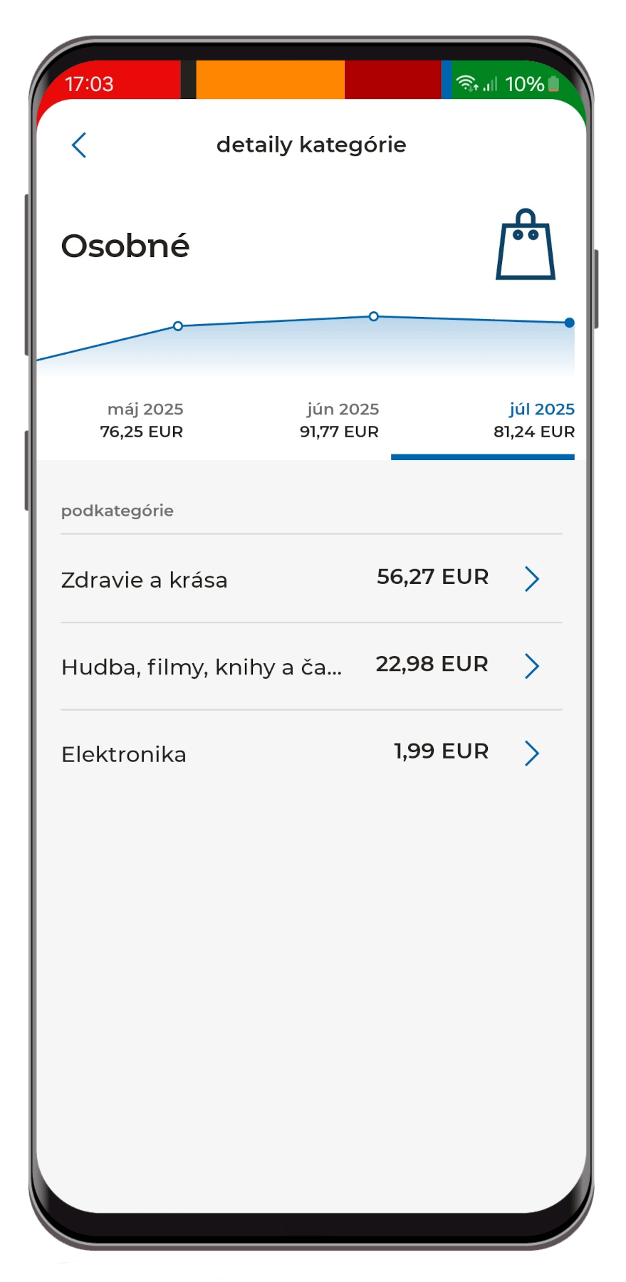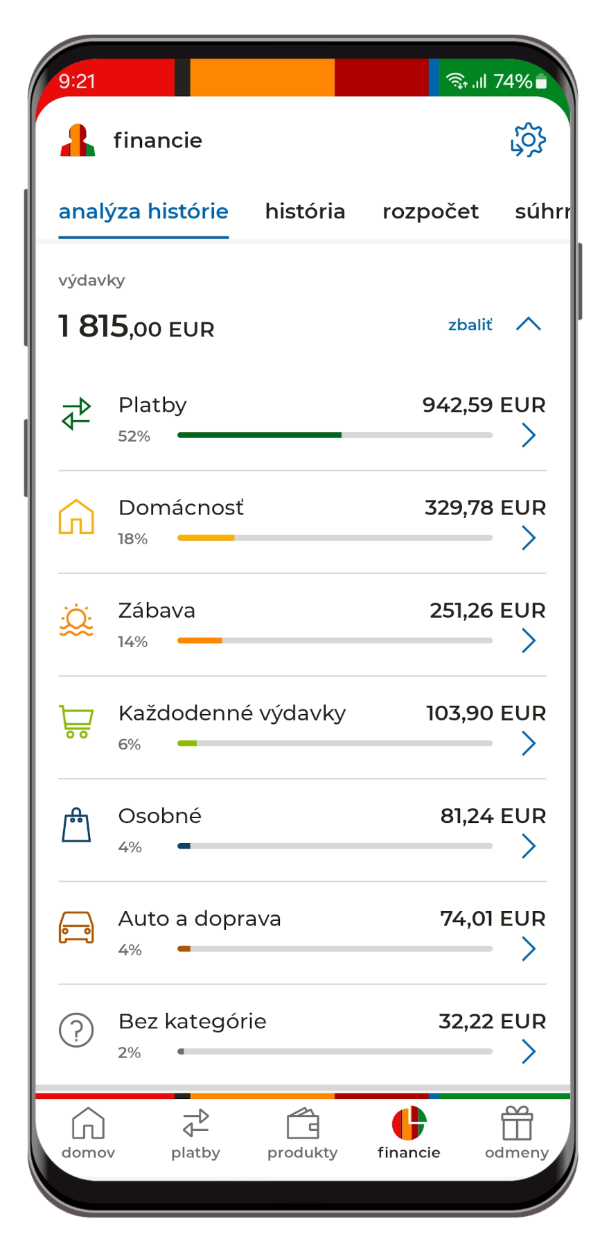 Všetky platby sa automaticky rozdelia do kategórií, ako je napríklad Doprava, Domácnosť alebo Zábava.
