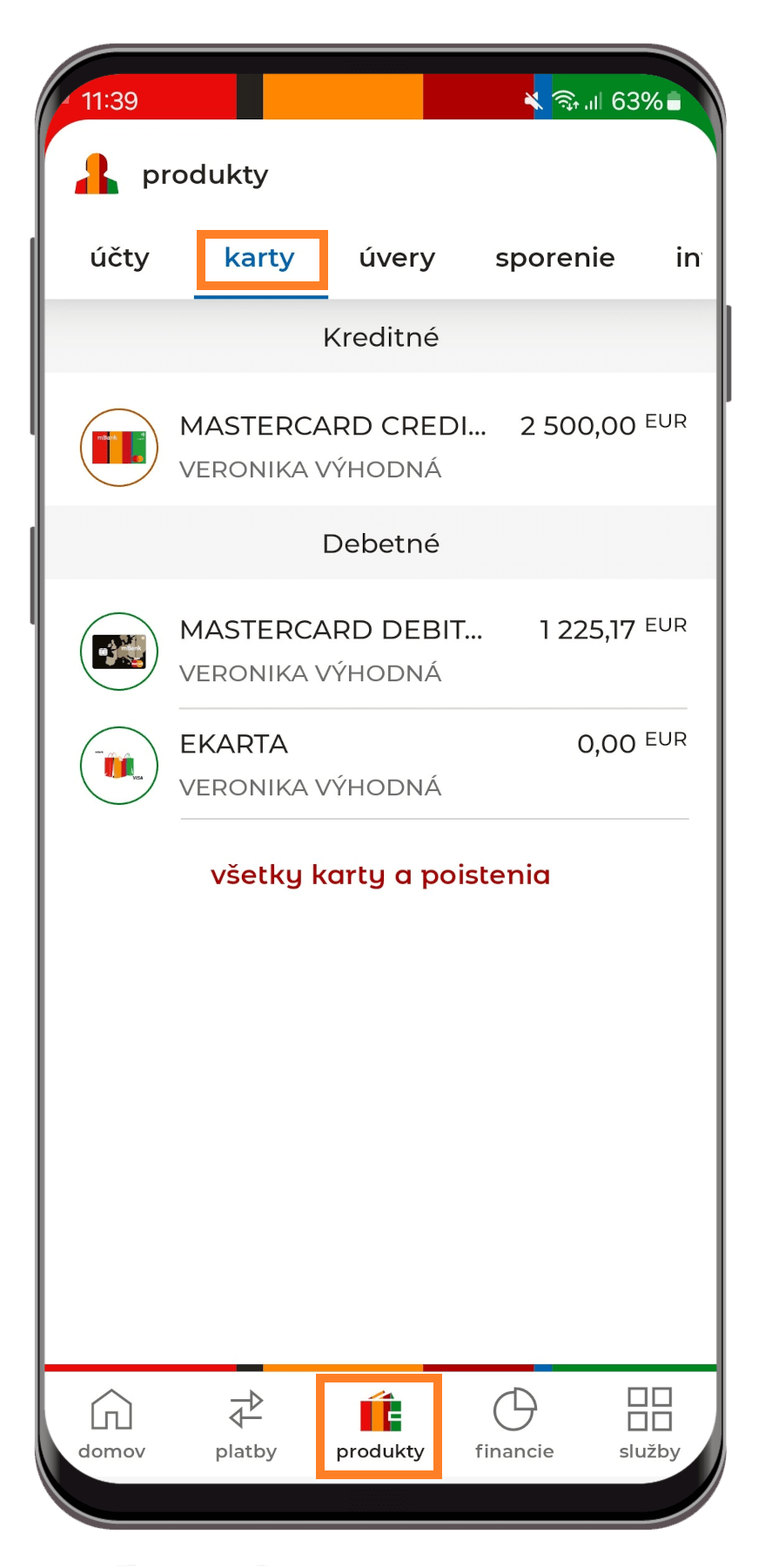 1. Prihláste sa do mobilnej aplikácie a prejdite do časti „Produkty“. Následne kliknite na záložku „Karty“ a potom na kartu, pre ktorú chcete autorizačné limity upraviť.