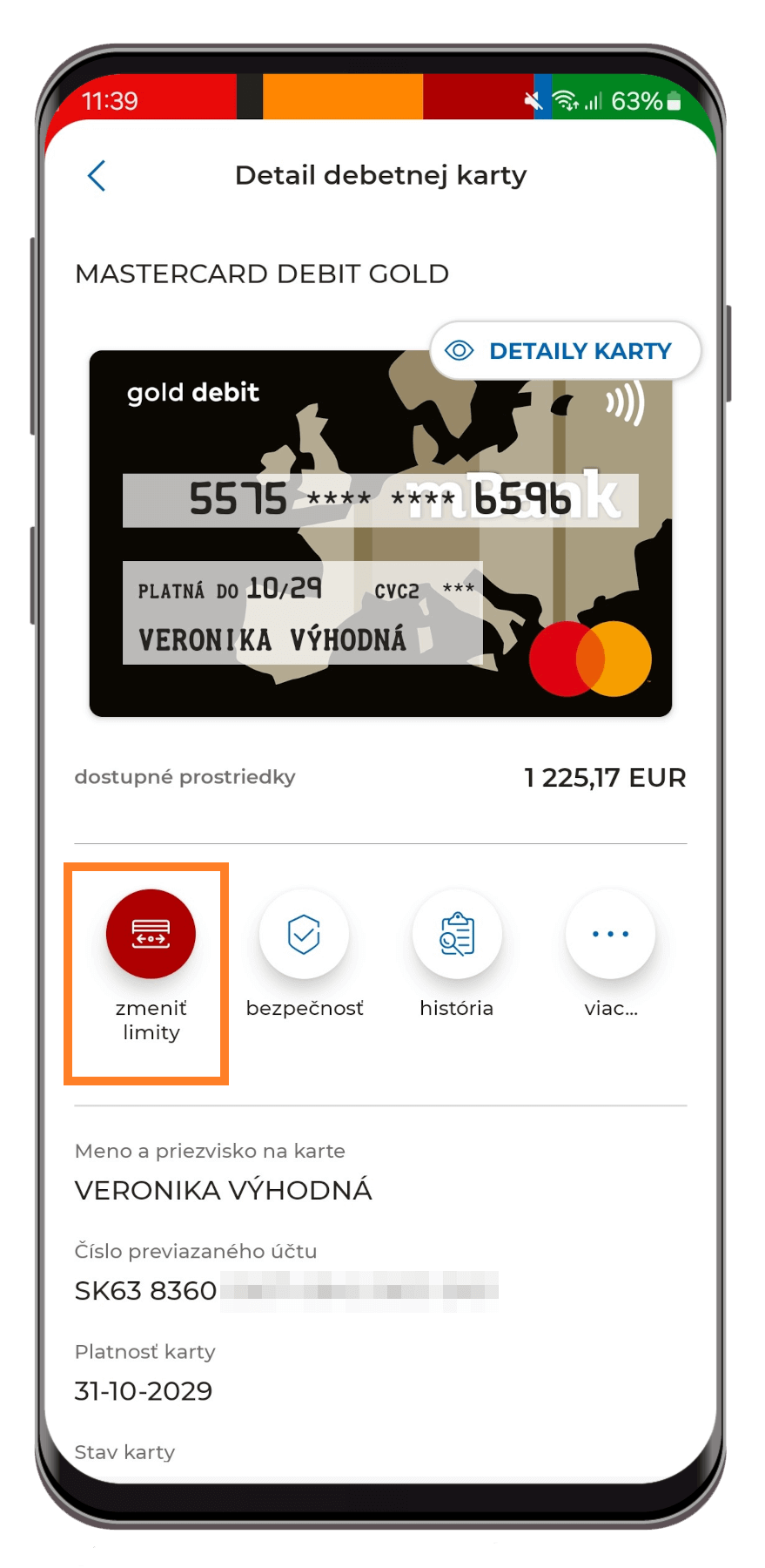 2. Zobrazia sa detailné informácie o karte. Kliknite na "Zmeniť limity".