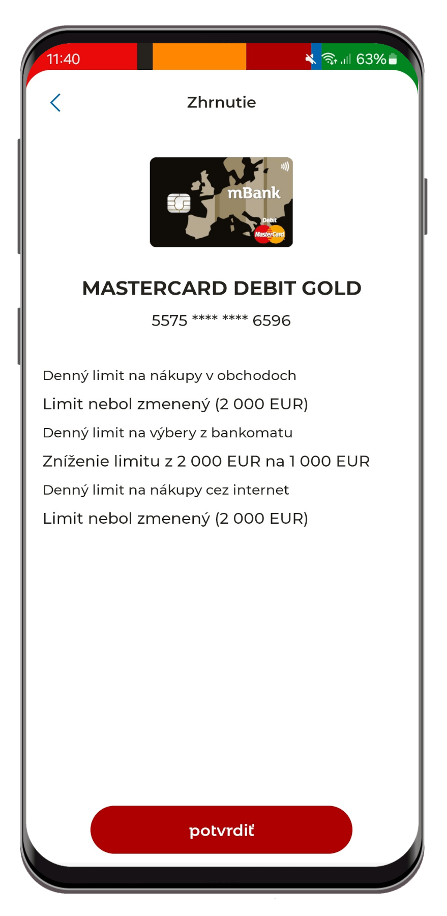 4. Skontrolujte nové nastavenie limitov. Potom kliknite na "Potvrdiť" a zadajte PIN kód aplikácie.