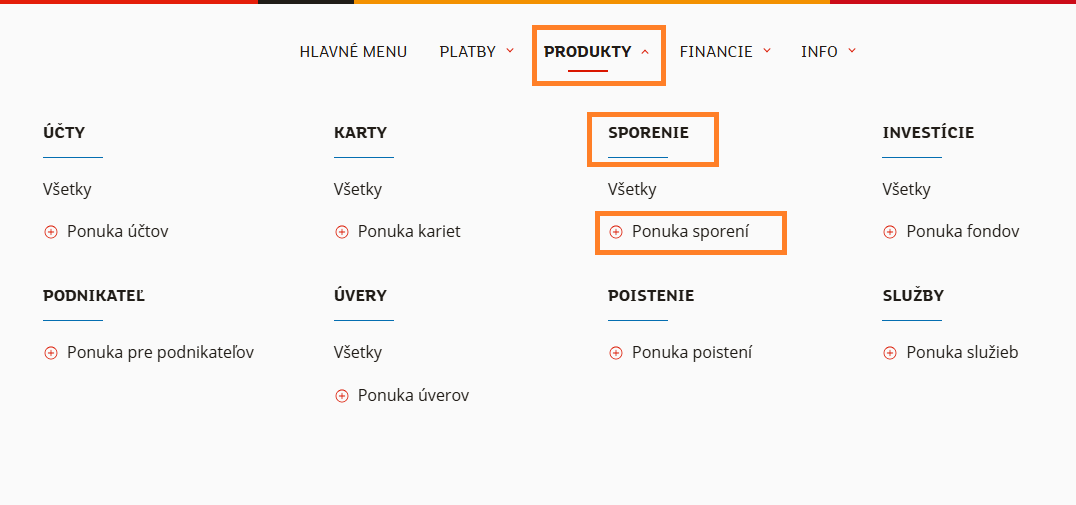 - Po prihlásení do internetového bankovníctva kliknite na položku PRODUKTY a v časti SPORENIE zvoľte Ponuka sporenia.