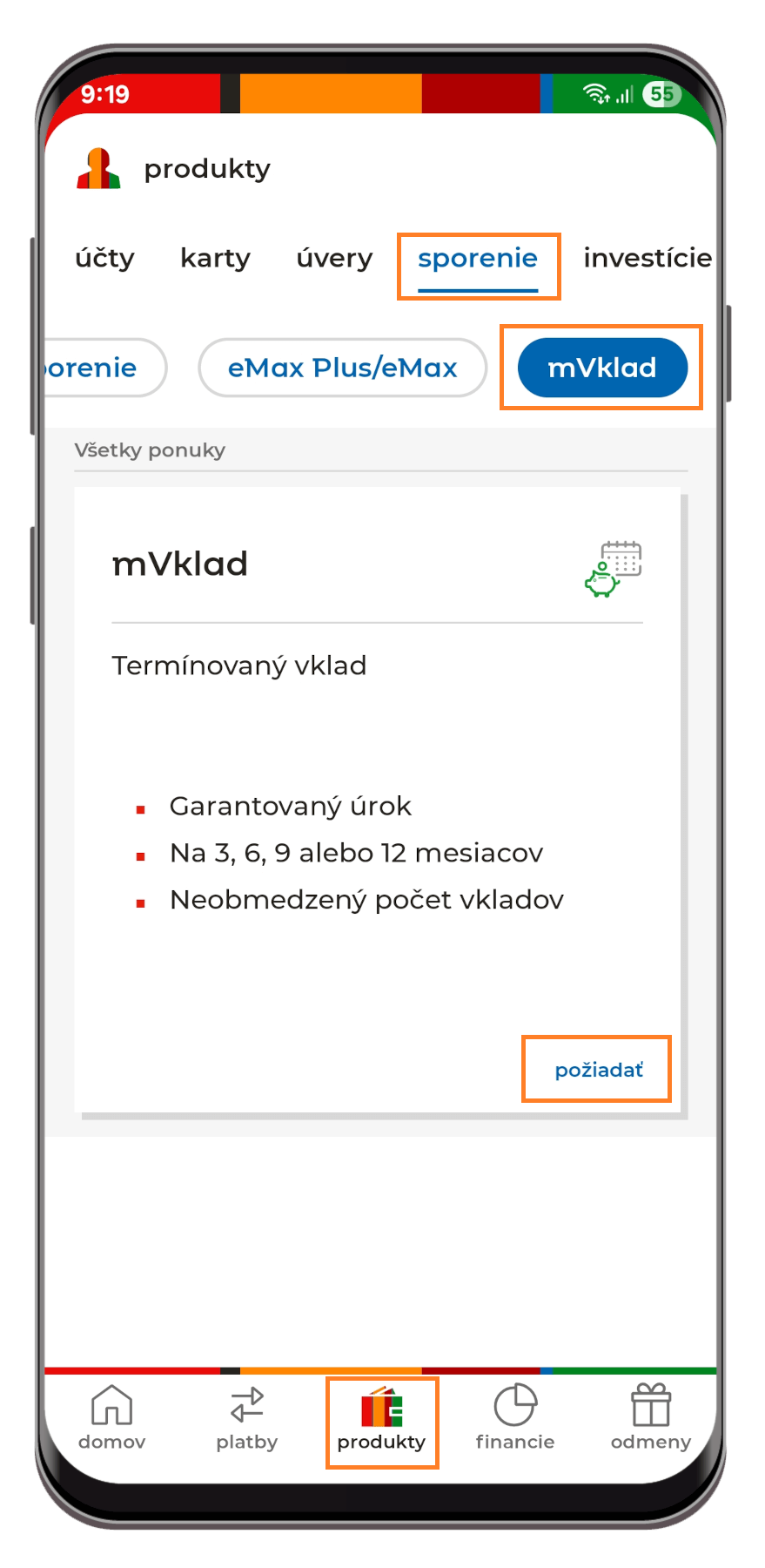 - Po prihlásení do mobilnej aplikácie si v dolnom menu zvoľte produkty, kliknite na záložku sporenia, prejdite do časti mVklad a kliknite na požiadať.