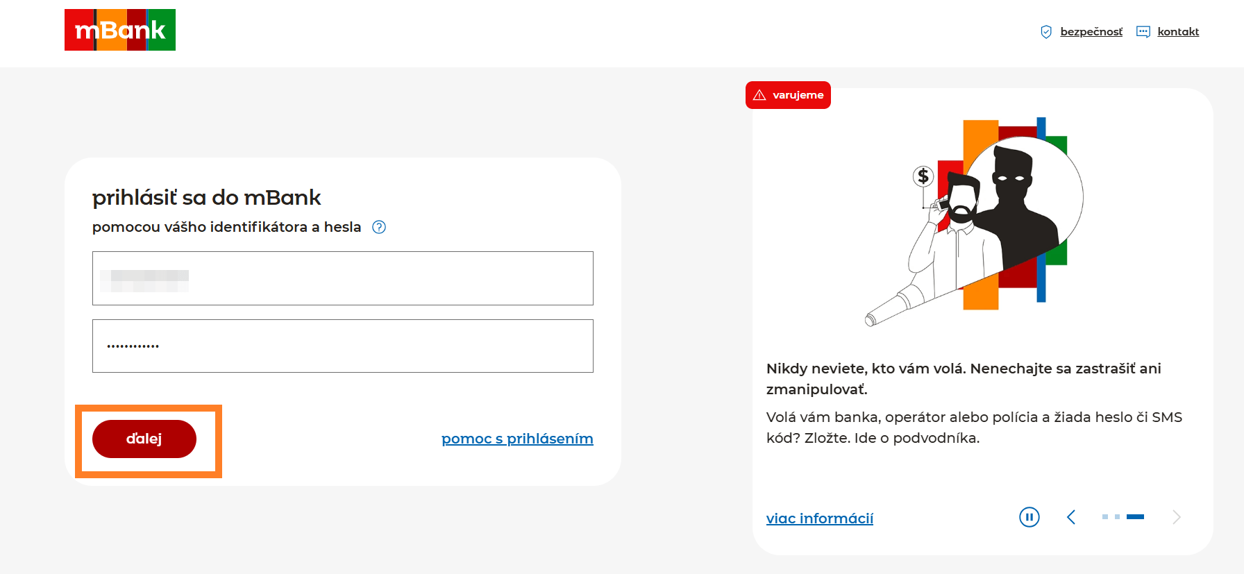 Otvorte prihlasovaciu stránku do internet bankingu (prejdite na www.mbank.sk a kliknite na tlačítko "Prihlásenie" v pravom hornom rohu). Do príslušných polí zadajte váš klientsky identifikátor a dočasné heslo do internet bankingu, ktoré ste našli v PDF dokumente. Kliknite na "ďalej".
