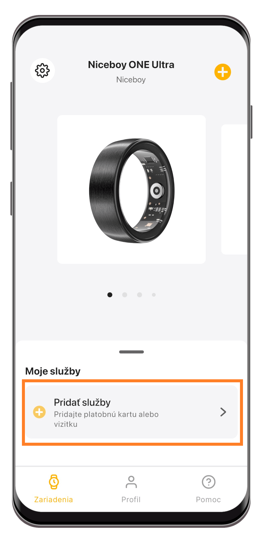 3. Pridajte do aplikácia svoj Smart Ring. Kliknite na „Pridať zariadenie“.